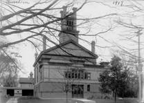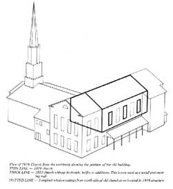 Such renovation of the original building, however, still failed to meet the needs of a growing congregation. At the annual meeting in 1911 a sinking fund was established for a new building, and the church’s seventy-fifth anniversary, although observed on the brink of World War I on March 1, 1917, provided the opportunity to accelerate fund raising for a new church. With the end of World War I, construction became possible. The last services were held in the original meetinghouse on July 20, 1919, because the new structure was to be built on the same site. For several months, the congregation was without a home. It held joint services with the Methodists, who also were building a church, in the Masonic Temple through August 17, 1919; and then the congregation held Sunday afternoon services in the basement of Underwood Baptist Church.