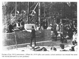 Finally, the congregation leased the lot on the southeastern corner of Church Street and Milwaukee Ave. and there constructed, with donated materials and the congregation’s labor, led by the example of its minister, the Rev. Howell Davies, a structure known as “the Tabernacle” that was used for services from November 1919 through May 1921.